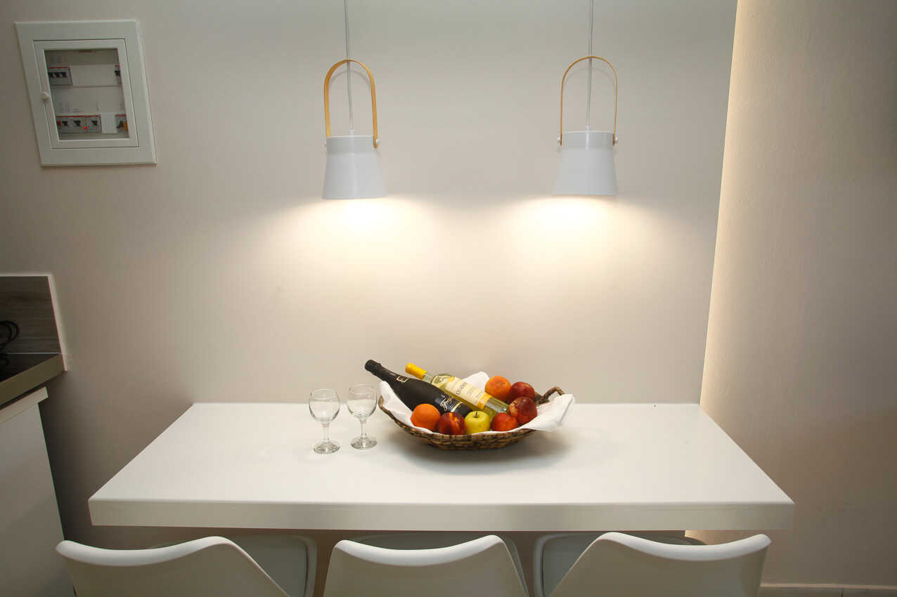 Εισερχόμενοι θα δείτε αριστερά σας μιας καλώς εξοπλισμένη μικρή κουζίνα με εστίες μαγειρέματος, τοστιέρα, μηχανή καφέ φίλτρου, ηλεκτρικό βραστήρα και όλα τα απαραίτητα είδη εστίασης και τραπέζι φαγητού με καρέκλες.